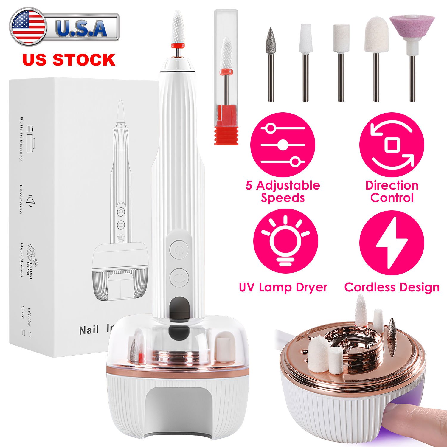 Our all-in-one professional nail drill kit includes 6 kinds of drill bits, which is suitable for grinding, carving, cutting, polishing for all nail arts as well as cuticle removal. With 5 adjustable speeds and F/R direction control, our electric nail drill enables precise and efficient nail artistry for both right-handed or left-handed user. Moreover, the charging base not only can recharge the electric nail drill, but also can be used as a drill bit storage case and UV nail dryer with timer setting. Functional, versatile and easy-to-use, it\'s an essential tool for nail-care professional person or beginners alike.
